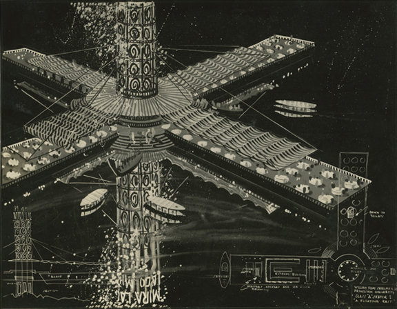 William Feay Shellman Jr. from Princeton University submitted this drawing for a Class A Sketch Problem for "A Floating Restaurant". Shellman became a professor of architecture at Princeton University from 1941 to 1986. Among his students were Robert Venturi and Hugh Hardy.
