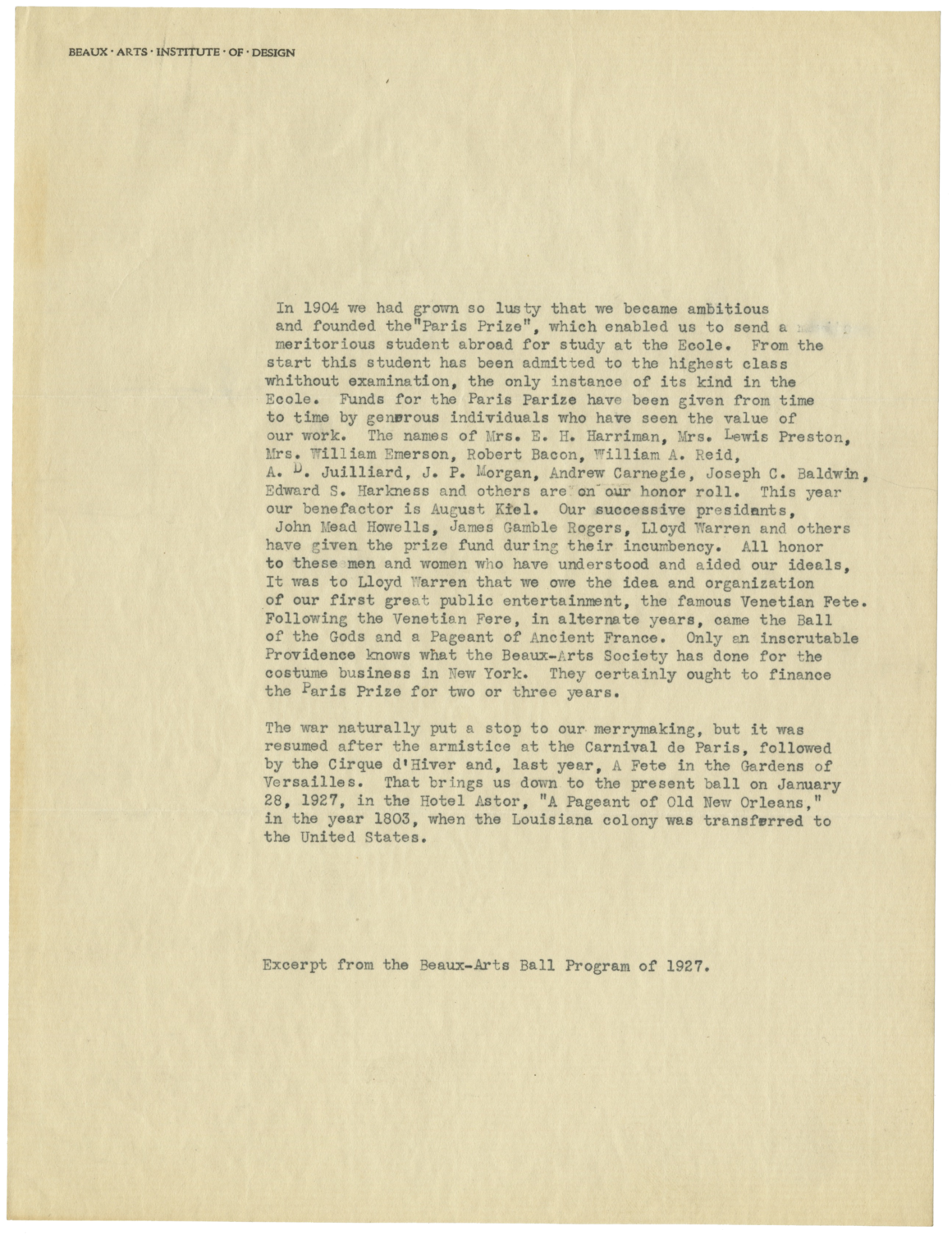 The Paris Prize was funded by private donors (J.P. Morgan, Andrew Carnegie, and others) until Lloyd Warren organized the "Venetian Fete" which became the yearly Beaux-Arts Ball. The event would raise enough money in one night to fund the Institute for an entire year.
