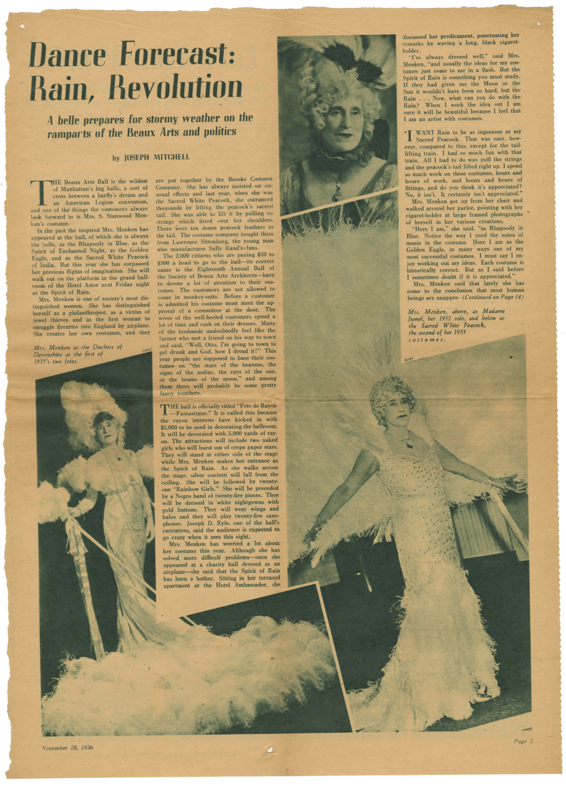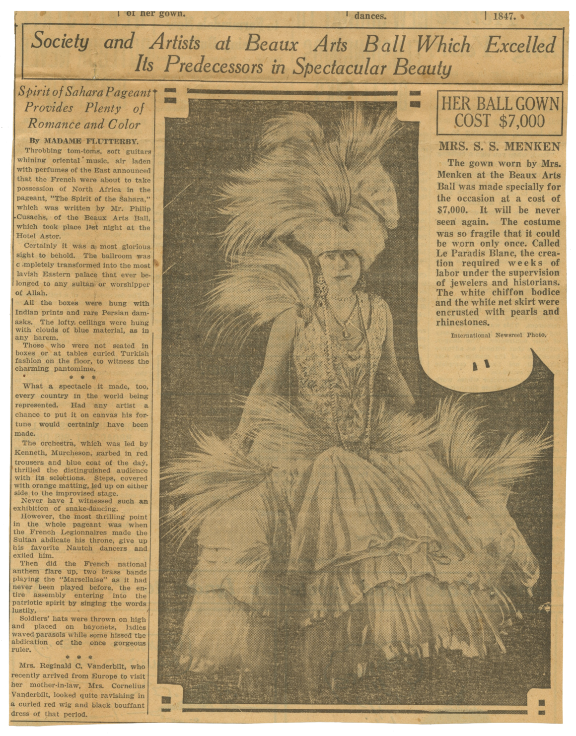 The costumes of the society ladies at the Beaux-Arts Ball were always something to look forward to. Mrs. Menken in particular was famed for her costumes. In 1928 her outfit cost a whopping $7,000. Called Le Paradis Blanc, the dress took weeks of labor to create under the supervision of jewelers and historians.