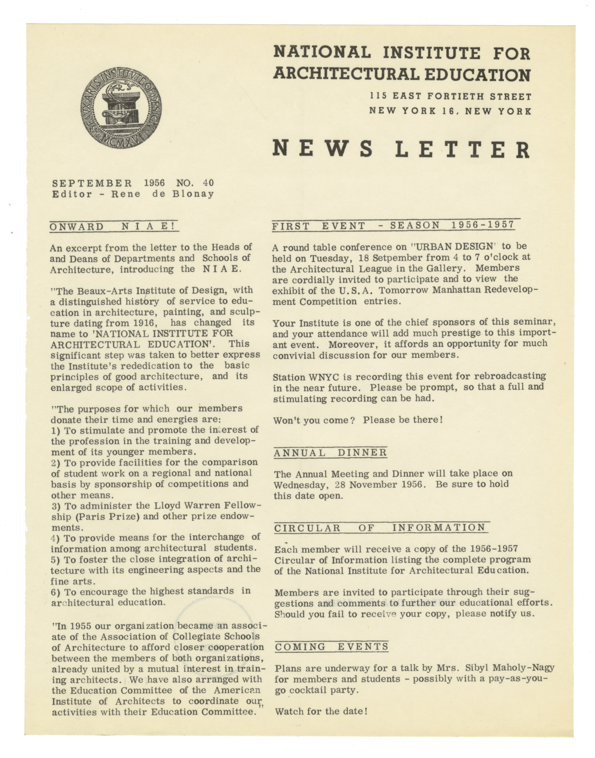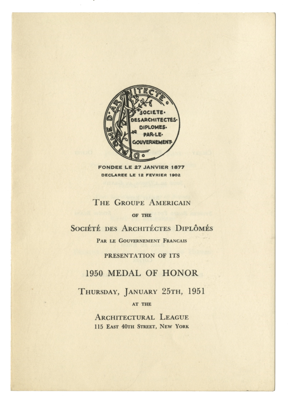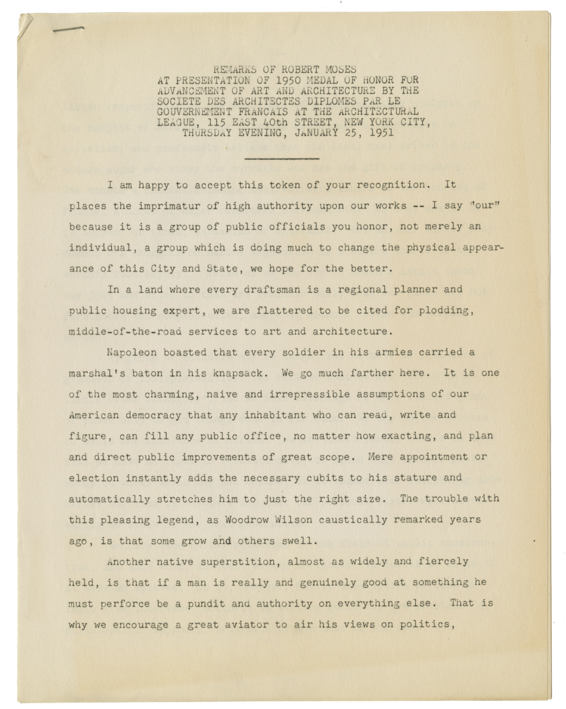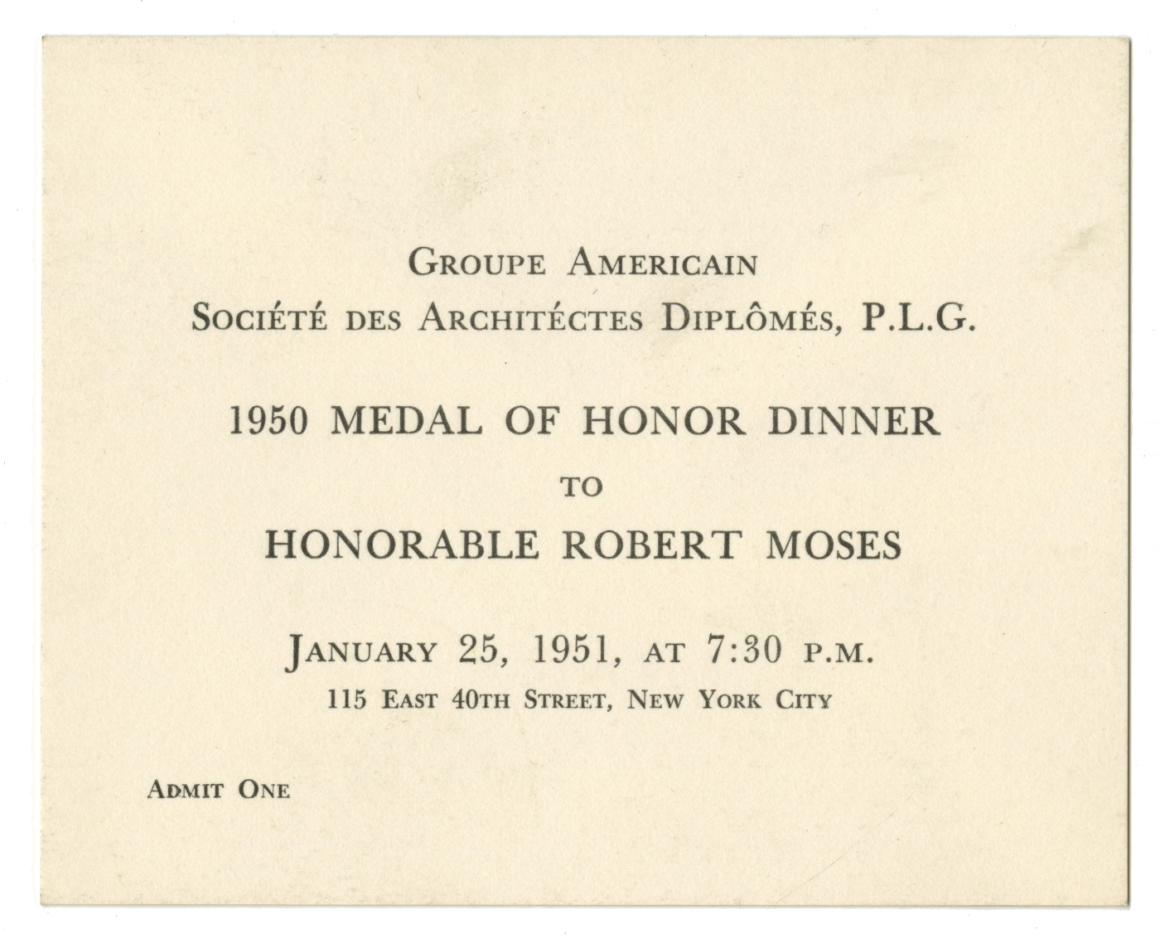 In 1950 the Société des Architectes Diplômés (SADG), an affiliate group of the Ecole de Beaux-Arts alumni, gave their annual medal of honor to Robert Moses. Moses’ acceptance speech represents a critical moment in the organizational commitment towards urban ideology and is evidence of his own attitude towards the subject.