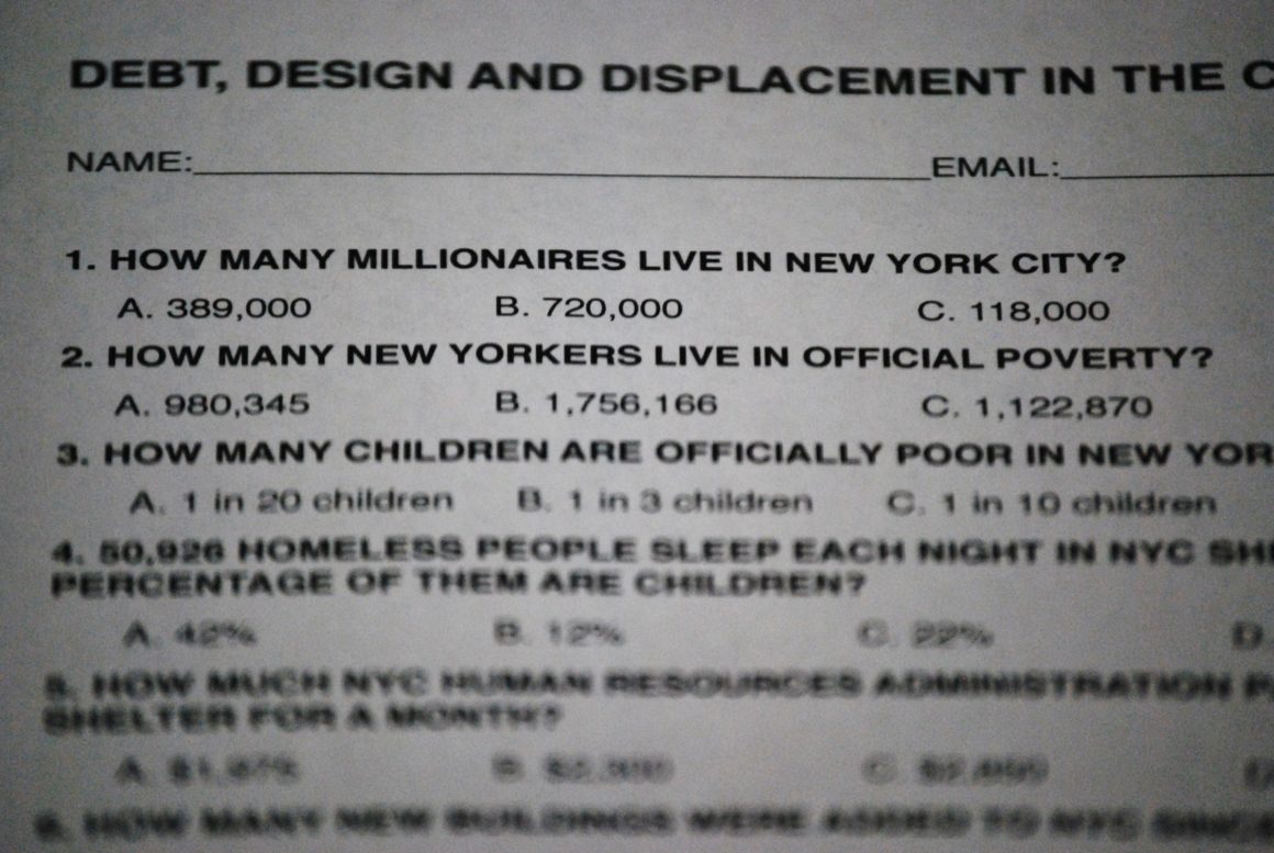 New York City is a place where one in three children live in poverty, and where more than 50,000 citizens sleep in homeless shelters. Increasingly, middle- and low-income citizens find it close to impossible to secure a home, often thwarted by spiraling debt and the encroachment of real-estate speculation. Van Alen Institute, in partnership with Miguel Robles-Duran and Gabriela Rendón, founders of Cohabitation Strategies and professors at the School of Design Strategies at Parsons The New School for Design, hosted a workshop to bring together researchers, designers, and activists on the forefront of strategizing ways to reverse these cycles of debt and displacement. Facilitators included Rob Robinson, housing rights advocate, co-founder of Take Back the Land, and active member of the National Economic and Social Rights Initiative; and Lorenzo Romito, architect, artist and co-founder of Stalker and Osservatorio Nomad. Through games, short presentations, and discussions, we built an understanding of the processes at work, in order to analyze the role that government, nonprofit organizations, designers, and cultural organizations can play in addressing this crisis of affordability.