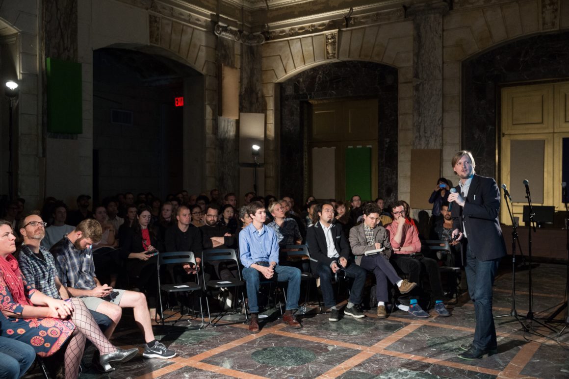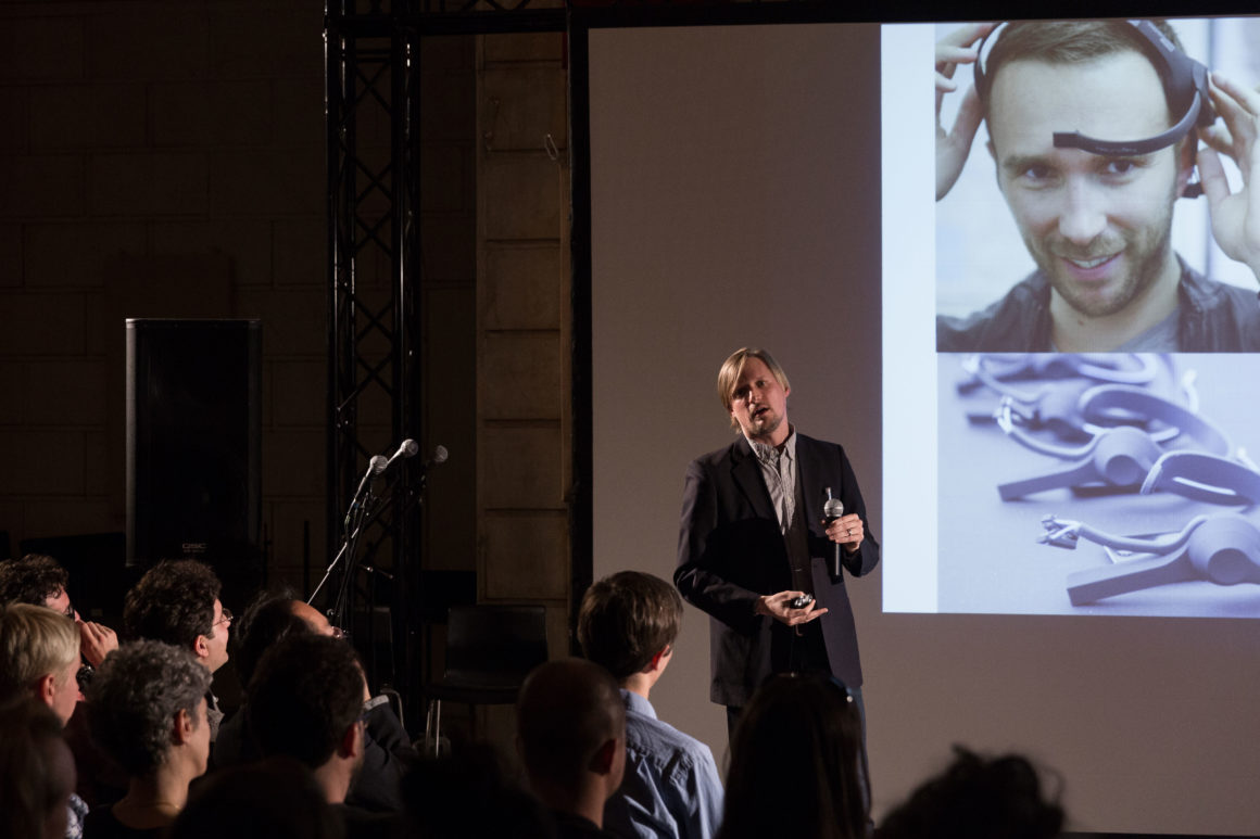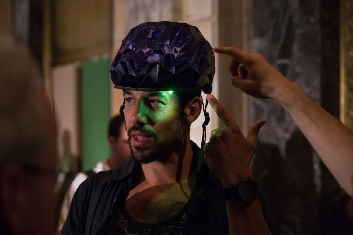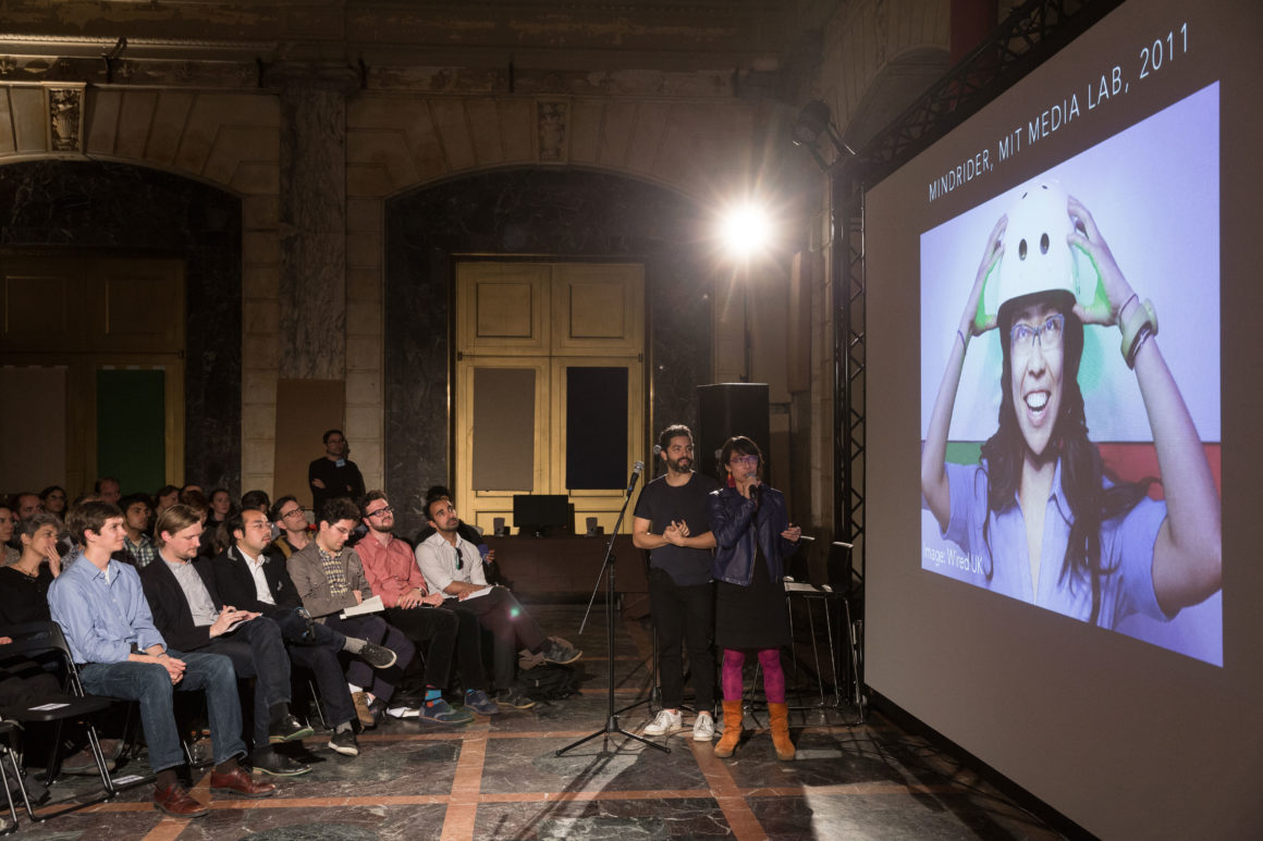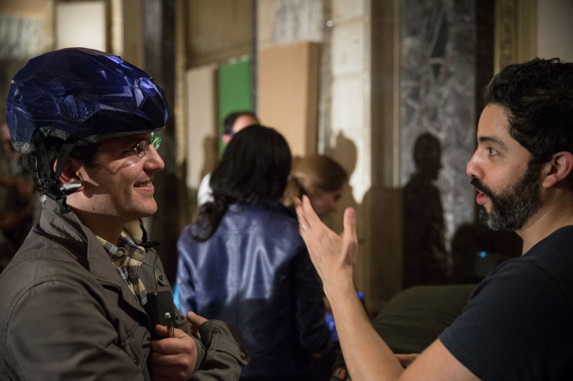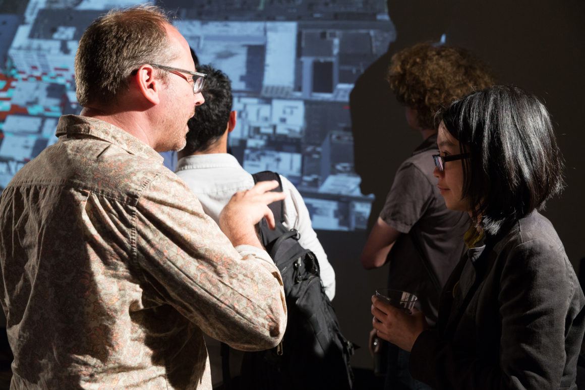 In advance of the event, we hosted a research workshop with Cloud Lab on Sunday, April 27 using mobile EEG technology to record the brain’s response as we explored Brooklyn’s DUMBO neighborhood. This brainwave data was aggregated into a spectacular visualization produced by Cloud Lab and presented on May 13. Other project demonstrations included OpenBCI, a low-cost, programmable, open-source EEG platform, and MindRider, a bike helmet with an EEG sensor that maps and displays users’ mental states. Drinks were served after the conversation.