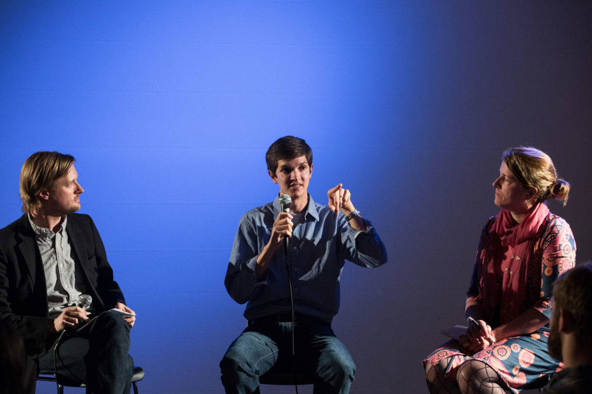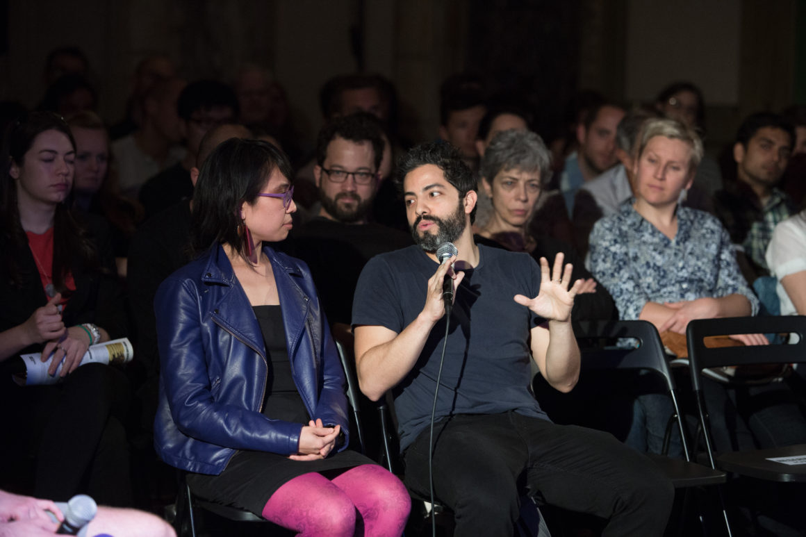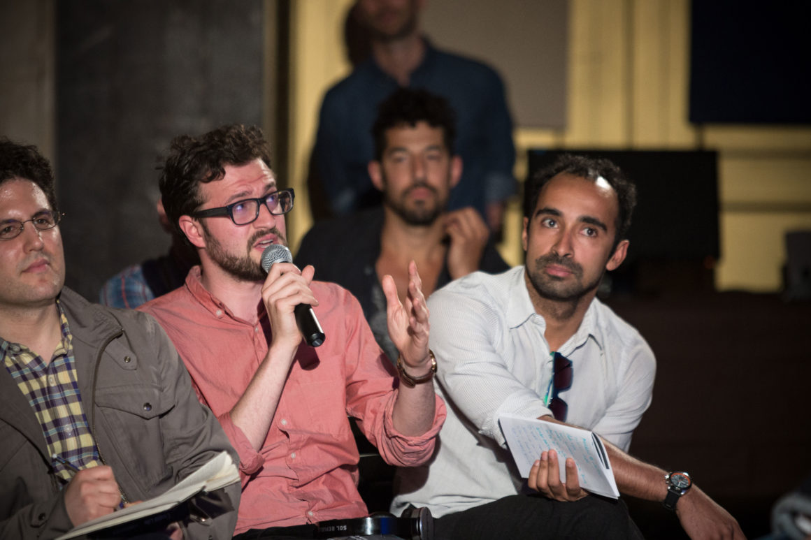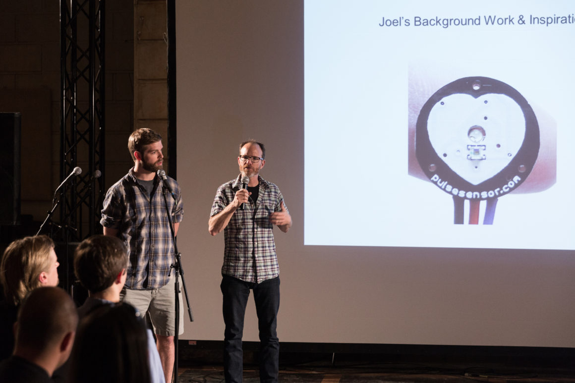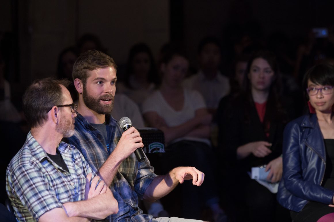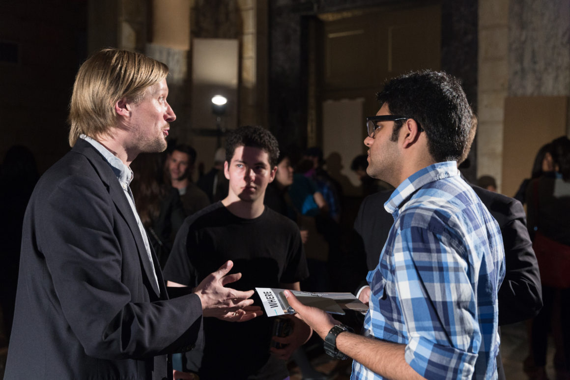 In advance of the event, we hosted a research workshop with Cloud Lab on Sunday, April 27 using mobile EEG technology to record the brain’s response as we explored Brooklyn’s DUMBO neighborhood. This brainwave data was aggregated into a spectacular visualization produced by Cloud Lab and presented on May 13. Other project demonstrations included OpenBCI, a low-cost, programmable, open-source EEG platform, and MindRider, a bike helmet with an EEG sensor that maps and displays users’ mental states. Drinks were served after the conversation.