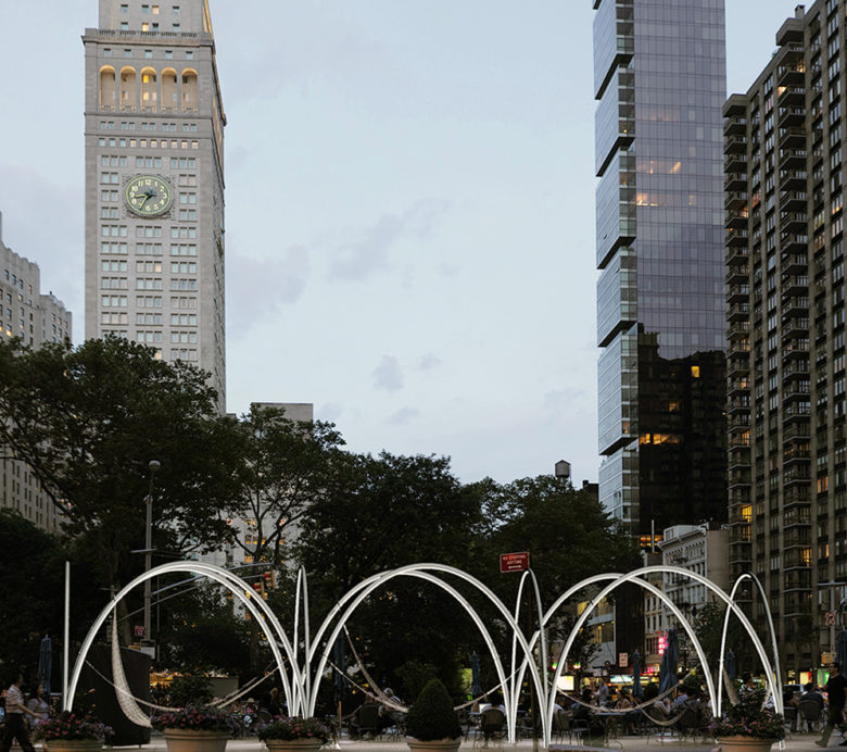 Flatiron Sky-Line is a series of 10 large contiguous arches, constructed of white powder-coated steel tubes with LED lights. Hammocks suspended from the arches allow visitors to relax and gaze upon the district’s architectural sights.