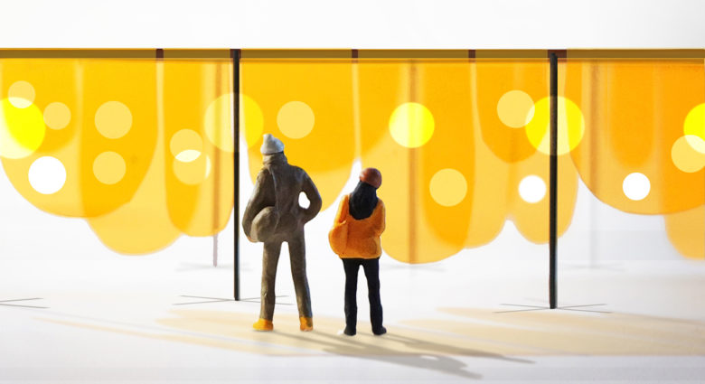 Happy defines both a figure and a place – an analog filter to see the city through warm colored eyes. Animated by movement, overlaps and overlays, it changes in the light inviting passerby to bask in its yellow glow while creating an instantly recognizable image of the flatiron plaza during the holidays. Within, its saturated color screen provides a soft color buffer encircling a more intimate space to host more programs and events. At night the panels reflect, shimmer and glow – the installation becomes a beacon in the cold winter month. During the panel filter and catch the sun to creating a striking landmark on the Flatiron Plaza.