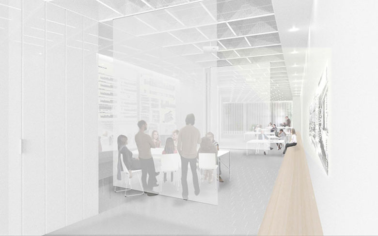 The winning team, a collaboration of Jon Lott (PARA-Project), William O’Brien Jr. (WOJR), and Michael Kubo (over,under), was selected from a group of three finalists invited by the Ground/Work jury to develop full design proposals over a six-week period. Collective–LOK’s proposal, titled Screen Play, presents a highly flexible space utilizing a subtle interplay of surfaces and screens to allow for the diverse range of uses demanded by the activities of the Institute, from multimedia exhibitions and lectures to workshops and private meetings.