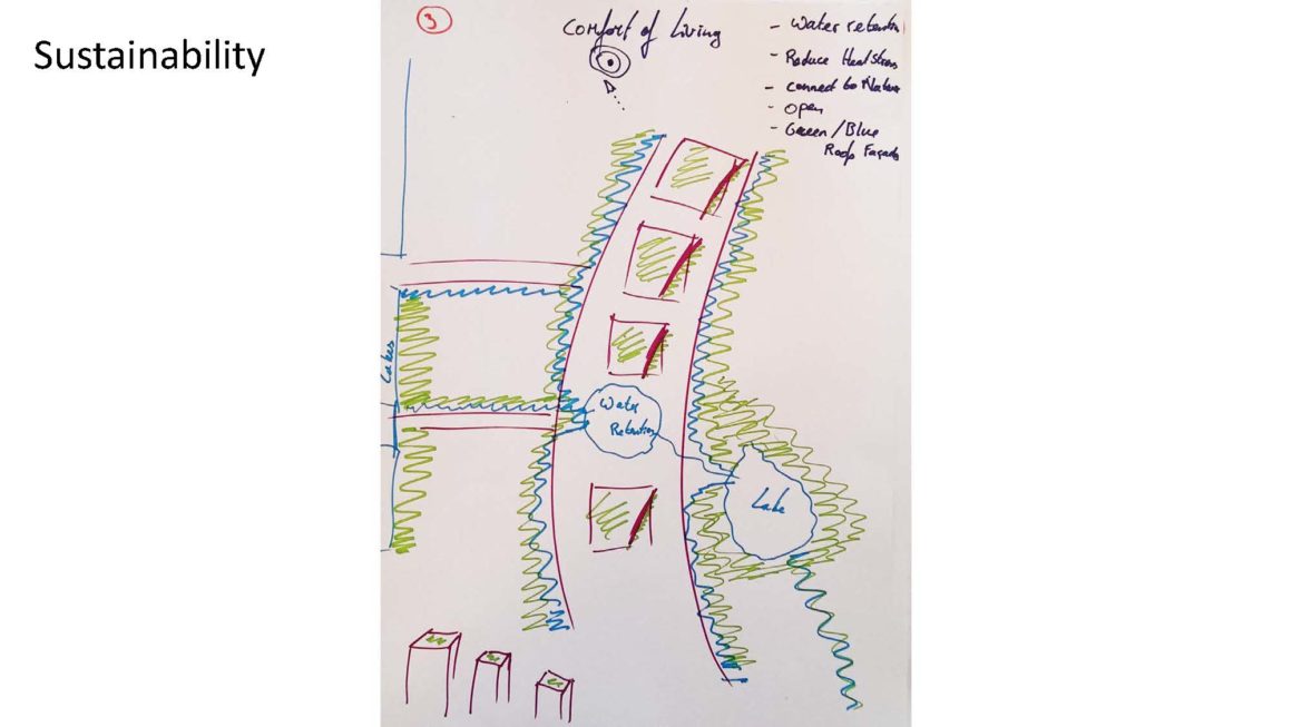 Anne Lise Kjaer, a Danish futurologist, believes that Denmark in 2060 will have the following components: more working from home, family time, local produce and goods, and reduced walking to shops. Knowing that Ørestad is currently a metropolitan island surrounded by wetlands, Team Three proposed that the development have a residential component around the edge of the large-scale current development (the best locations) with social spaces – affordable housing and affordable spaces for creative and interesting businesses that bring back the human scale.