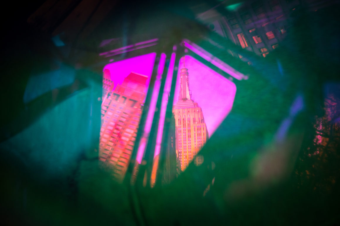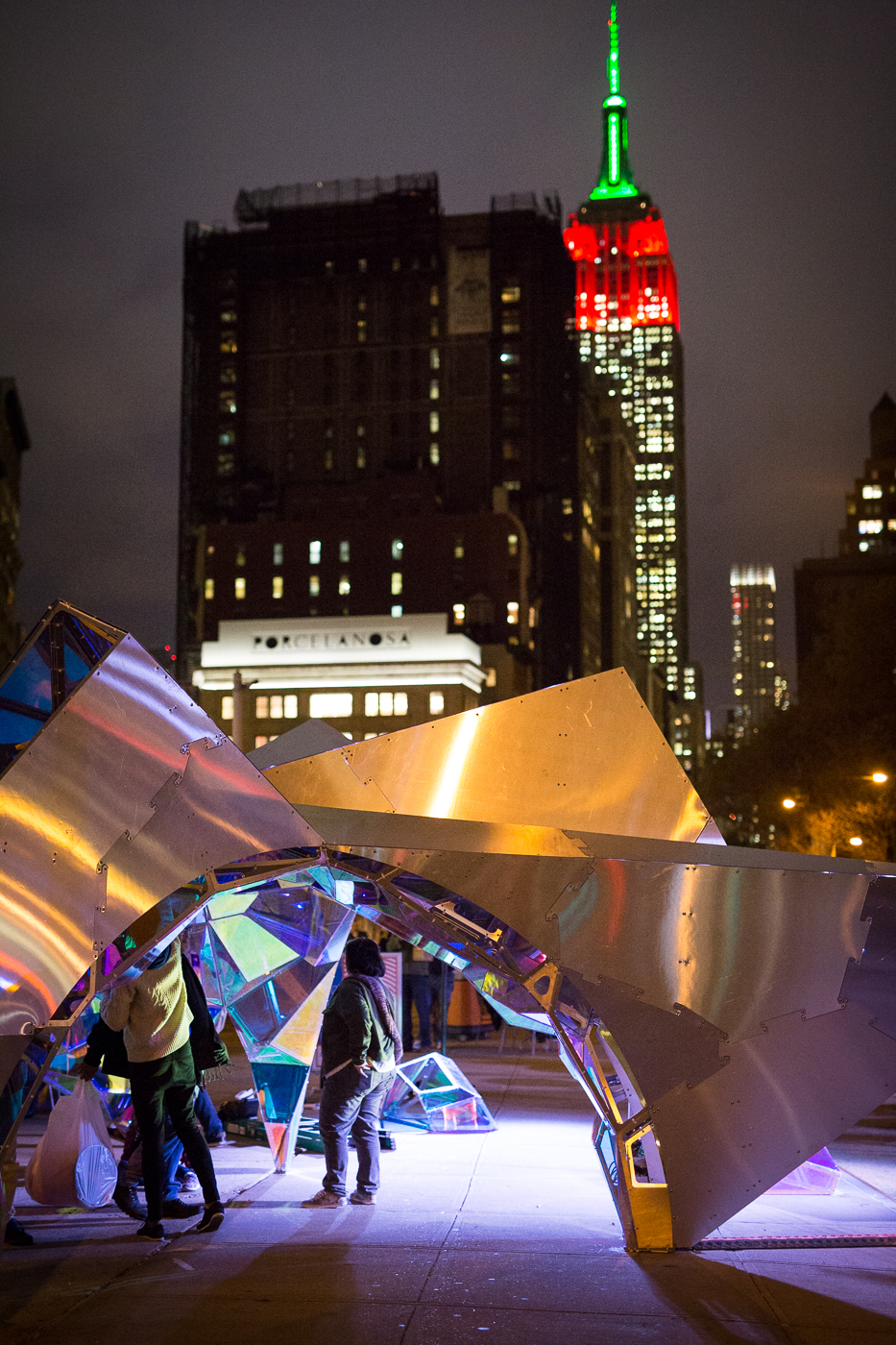 The crystalline Nova installation compels passersby to enter the structure and gaze onto Flatiron’s iconic landmarks, framed by apertures in the installation’s exterior. The placement of scopes, or viewing cones, is arranged to represent a centralized proverbial North Star for the Flatiron District, with each scope pointing to a distinct landmark. In effect, Nova acts as an observatory for the “constellation” of iconic sites: the Flatiron Building, Met Life Tower clock tower, Empire State Building, and surrounding landmarks. LEDs within Nova react to sound and create a pulsating light effect when activated.