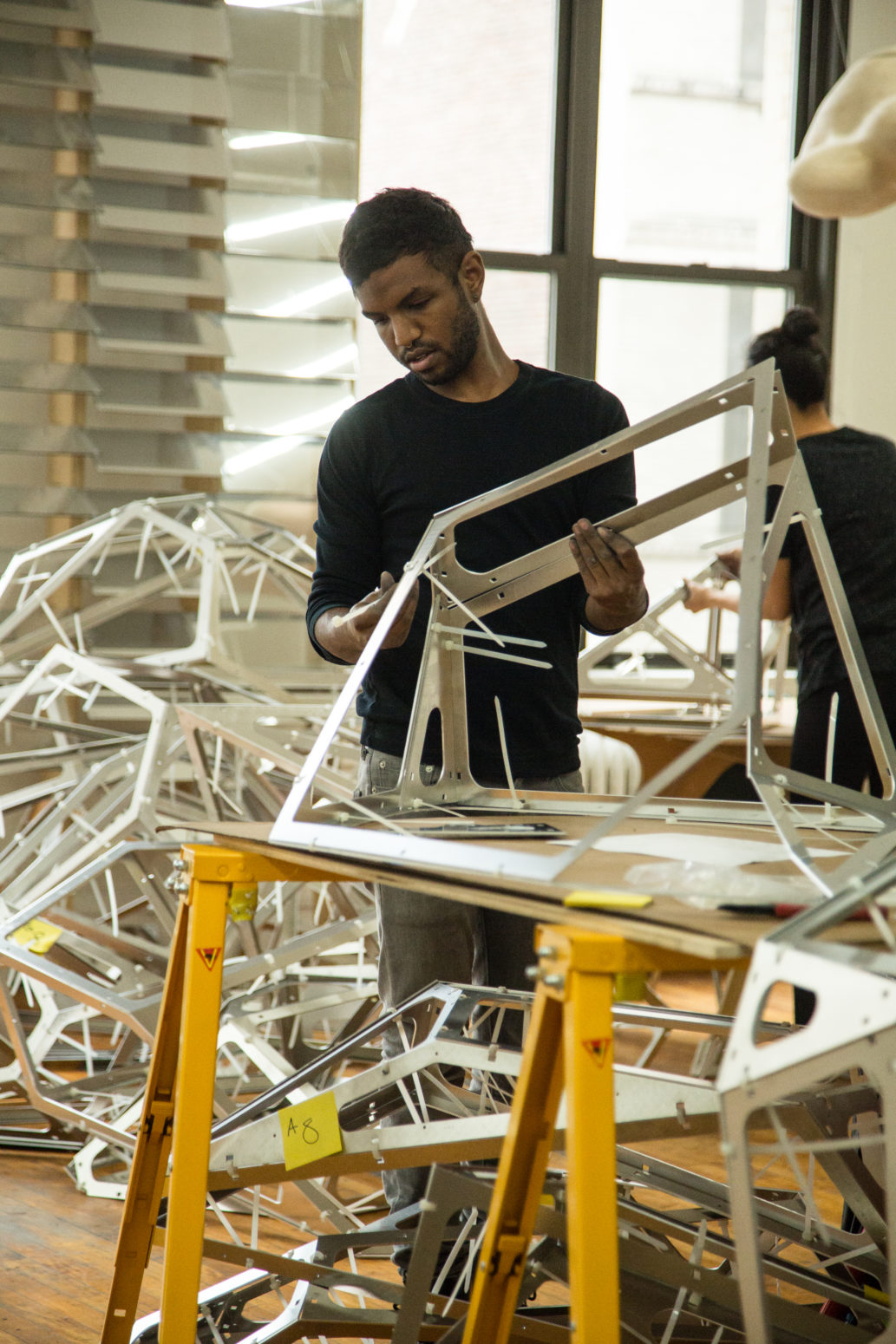 Land/Mark addresses the relationship between iconic landmarks and ecological life by constructing an installation within the shadow of the Flatiron Building onto the plaza, creating a feedback loop between what Method Design identifies as three elements of landmark-making: place-making, achieved through a single meandering curb with sloping planes; space-making, demarcated by synthetic reeds that diffuse light and offer moments of privacy; and social amplifications, manifested in the proposal’s public furniture. The piece as a whole becomes its own micro-urban system that taps into and creates new context, memory, and inhabitation in the city. Method Design is led by Reese J. Campbell and Demetrios A. Comodromos.