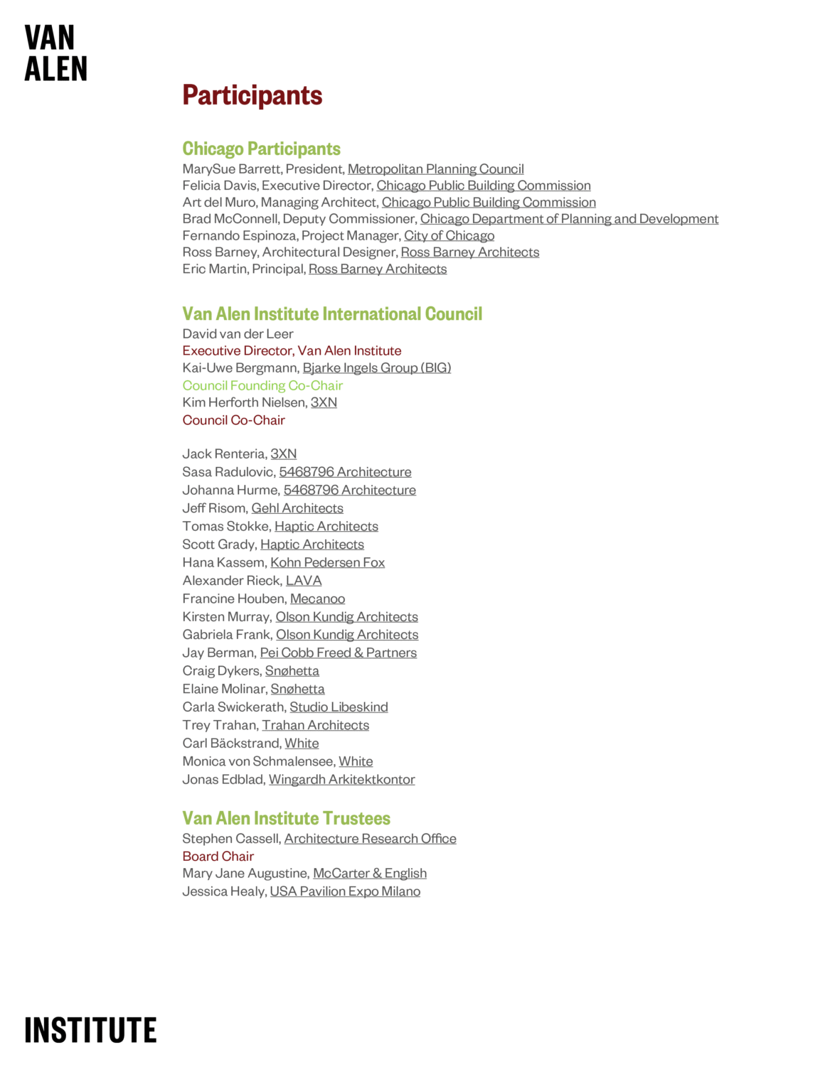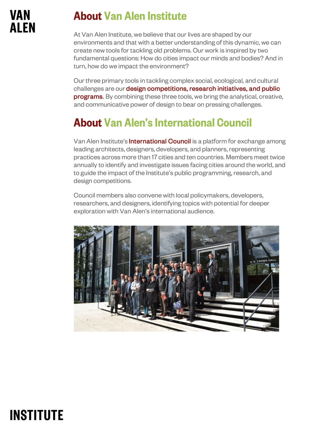 The International Council is a platform for exchange among leading architects, designers, developers, and planners, representing practices across more than 26 cities and 15 countries. Members meet twice annually to identify and investigate issues facing cities around the world, and to guide the impact of the Institute’s public programming, research, and design competitions. Council members also convene with local policymakers, developers, researchers, and designers, identifying topics with the potential for deeper exploration with Van Alen’s international audience.