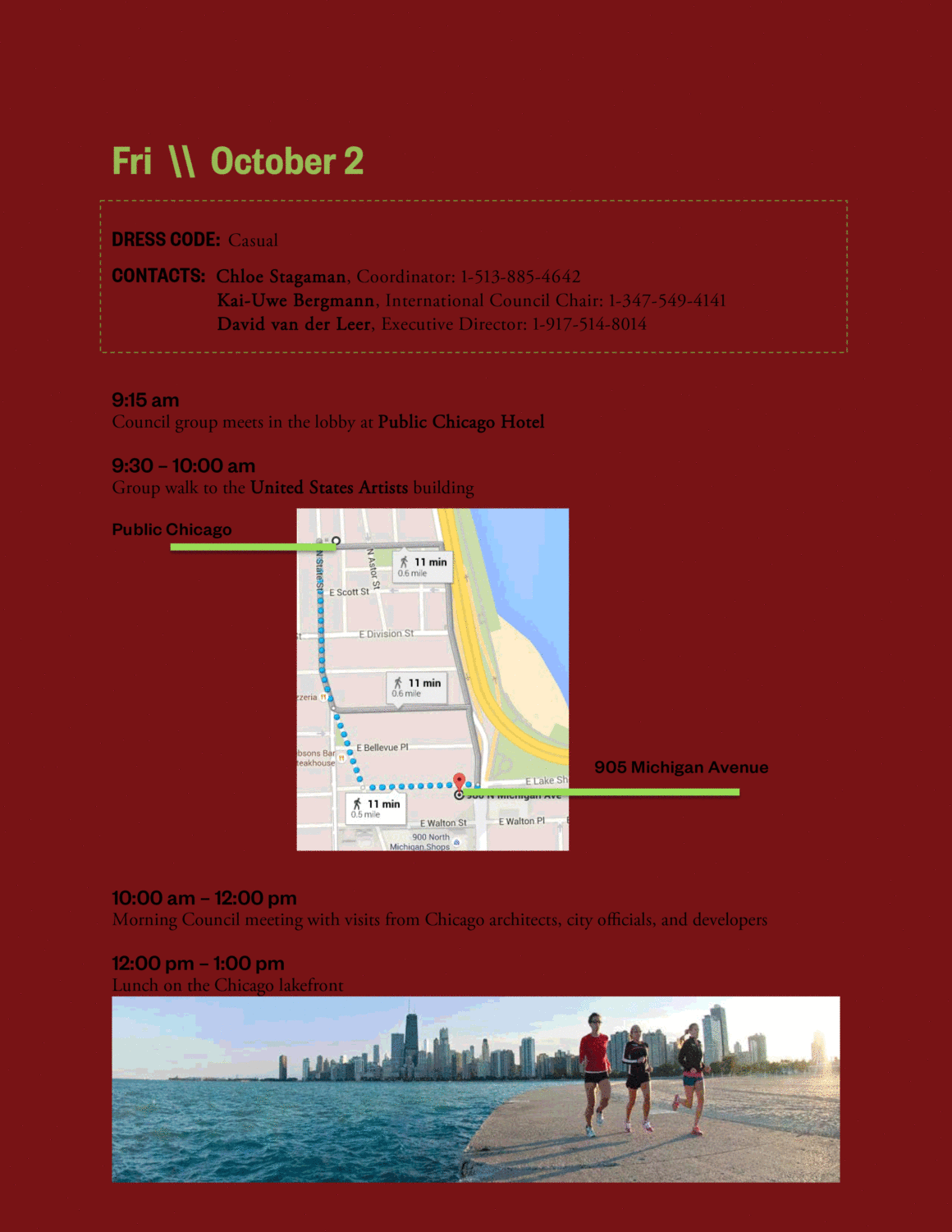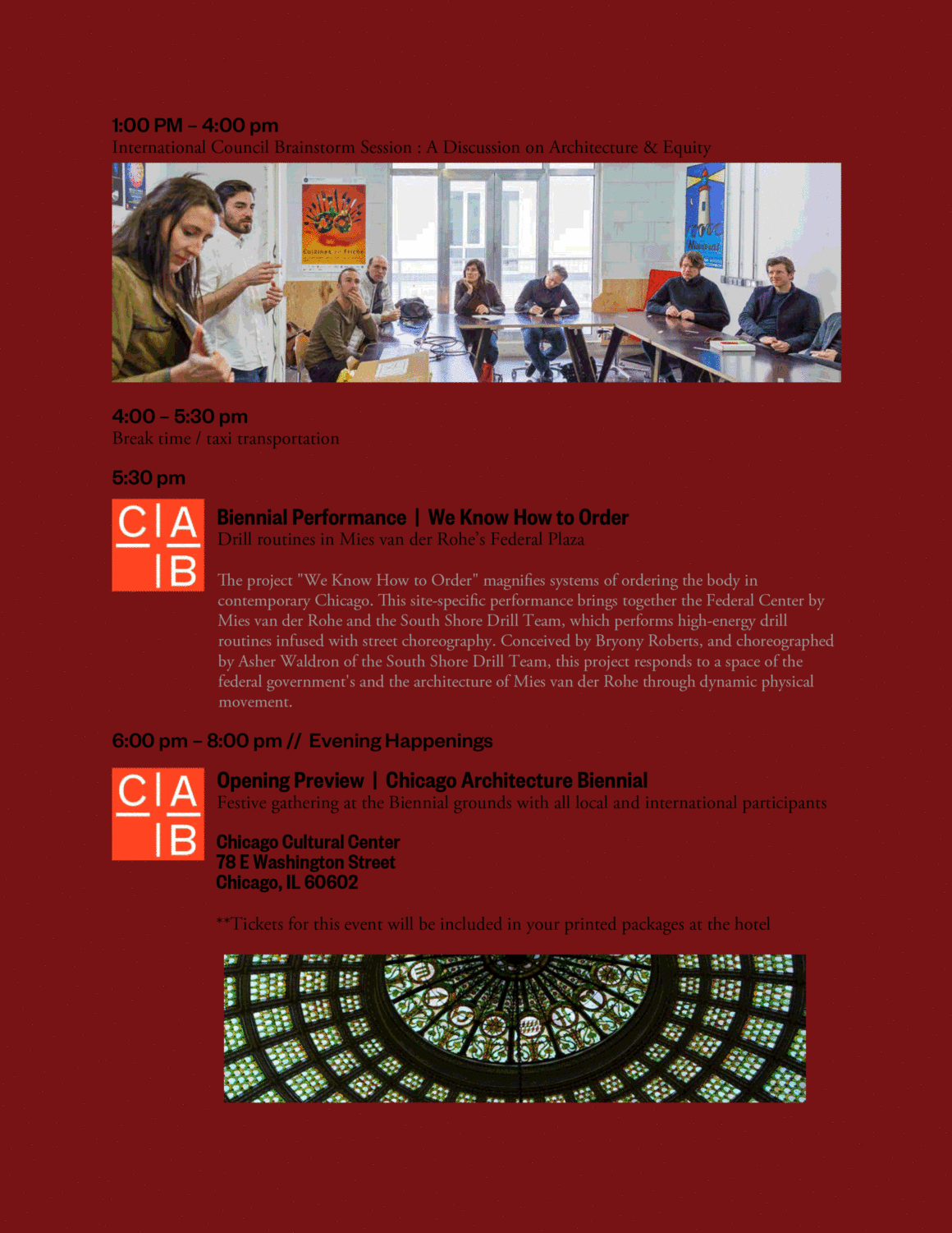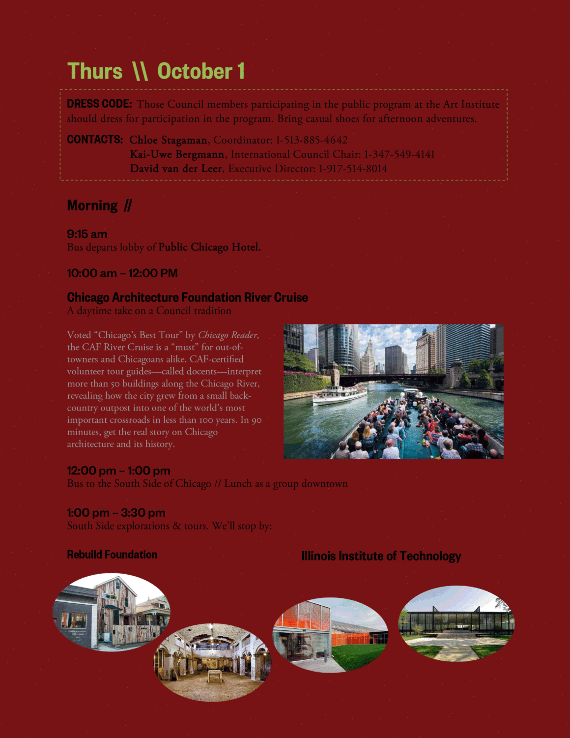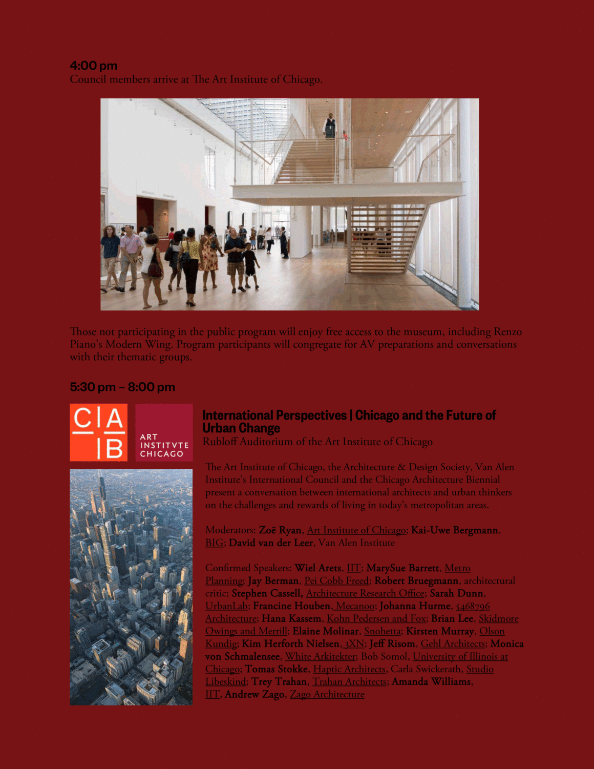 The Council is currently led by Co-Chairs Alfredo Carabello and Daniel Elsea of Allies and Morrison, and Carl Bäckstrand and Monica von Schmalensee of White Arkitekter. The next International Council meeting will be held May 15-17, 2019 in London.
