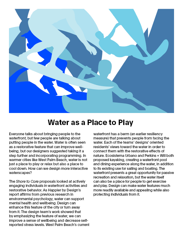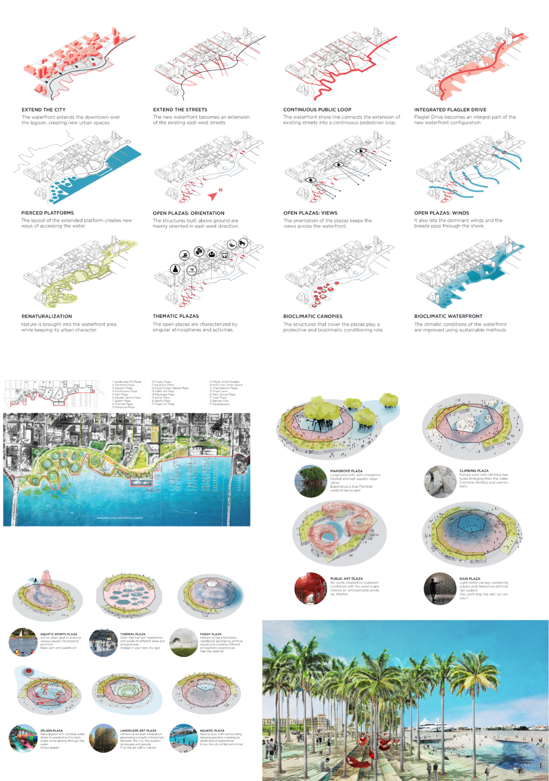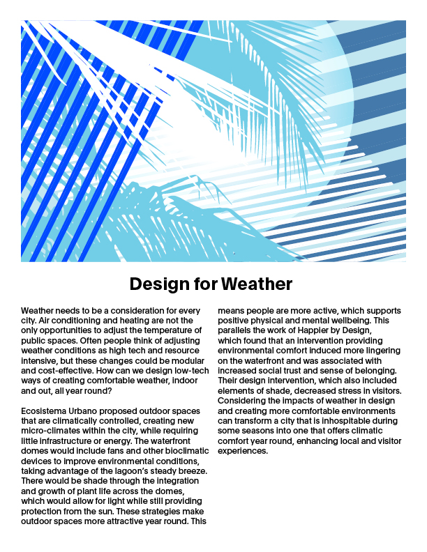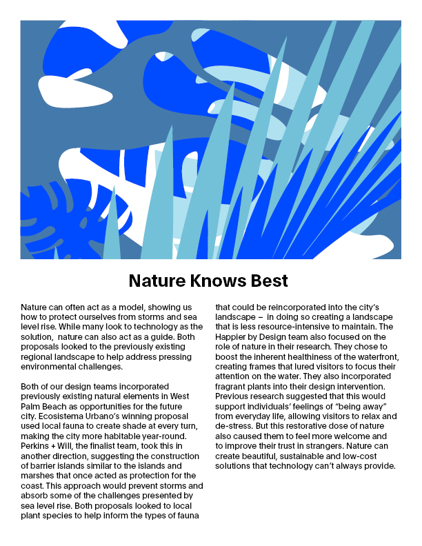 Design and architecture have the opportunity to increase well-being and health for residents and visitors. The strategies proposed by the design and research teams magnify the importance of consideration for the role that complexity, flexibility, weather, and resilience play in design. By incorporating these elements into a city’s landscape, we can create more attractive spaces that are amenable to residents, visitors, and diverse populations. The proposals created for West Palm Beach can act as a guide for waterfront cities everywhere.