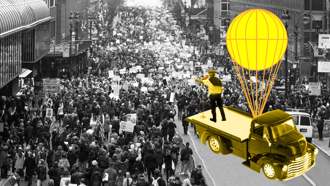 Protests draw power from the places where they occur, whether in front of a government institution or within the heart of a community. To help people amplify their presence and their voices, we propose a mobile and distributed infrastructure that stands apart from everyday life and goes to the places where people feel their voices need to be heard. This mobile “flock” supports protest and free speech by harnessing and augmenting familiar technologies like social media that are crucial for assembling networked collectives spread across the city and mobilizing people for action. Bridging digital and physical realms, a series of hovering, interactive place markers share and disseminate moments and messages from events throughout the city.