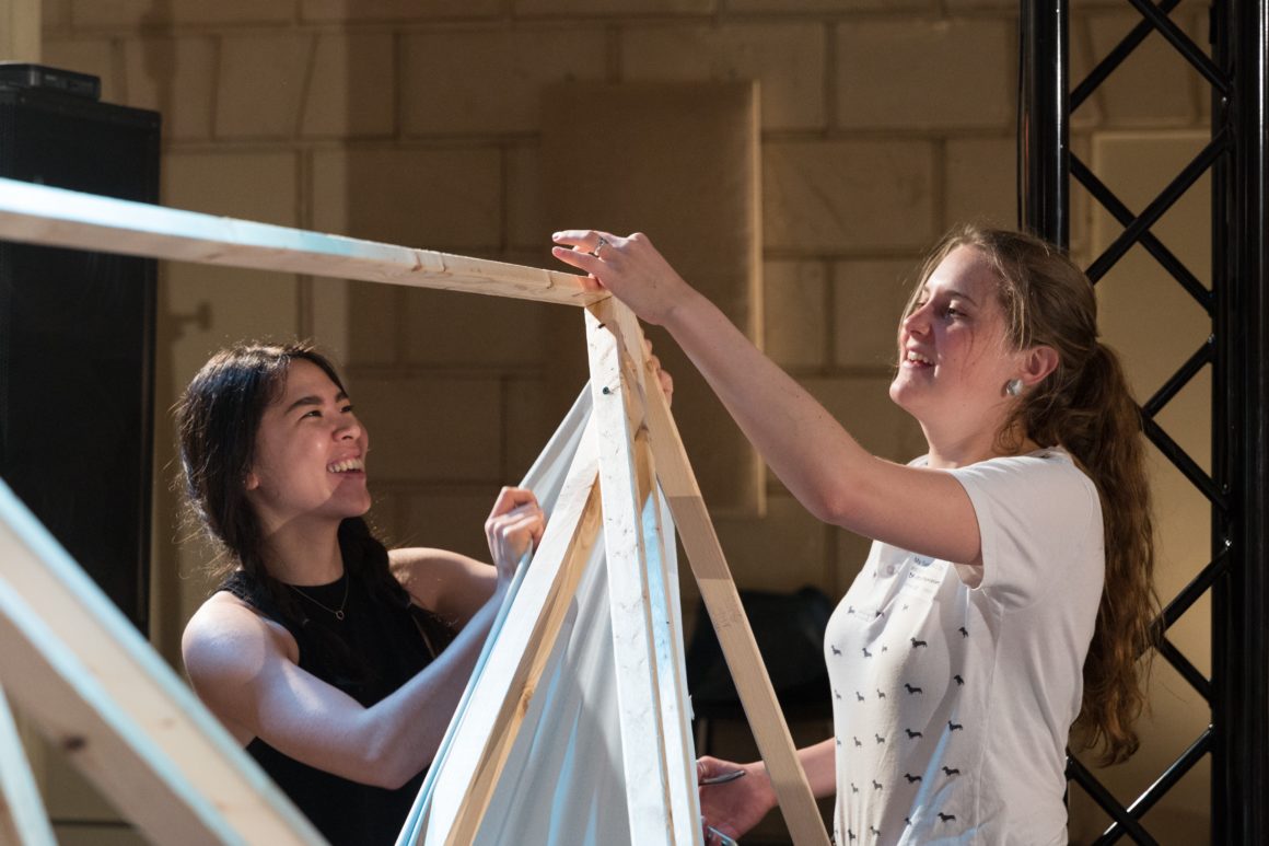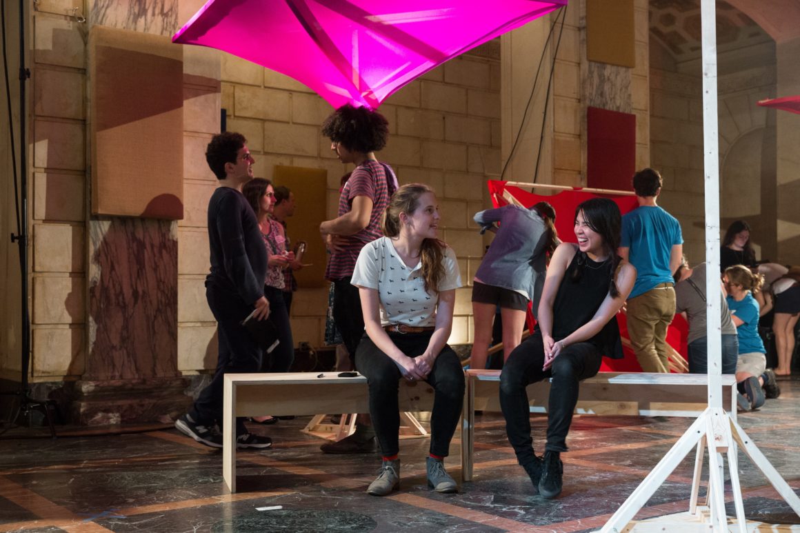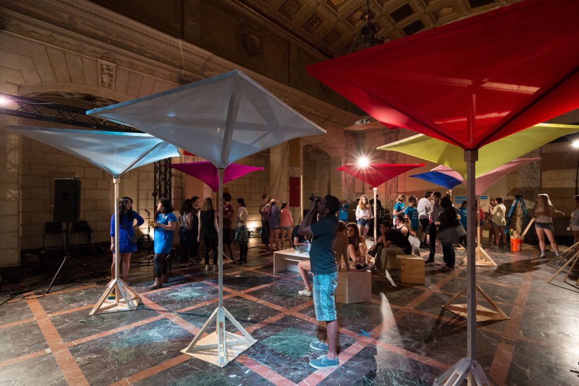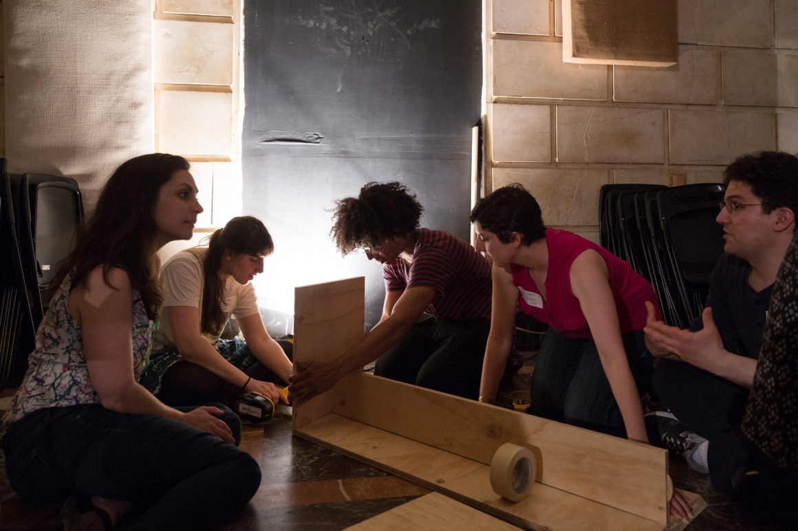 Instead, the nearby ISSUE Project Room rang with the sound of people working together to figure out how to make sturdy canopies and benches from of the materials they had in front of them. The largely teenaged group arrived with no particular building skills, but with some guidance they created a physical space for the lively conversation about public space that followed. It was the first in-depth exploration of the broader issues sketched out the night before in The Imprint of the City, the event that launched Van Alen Institute’s Spring 2014 Events continuing Elsewhere.