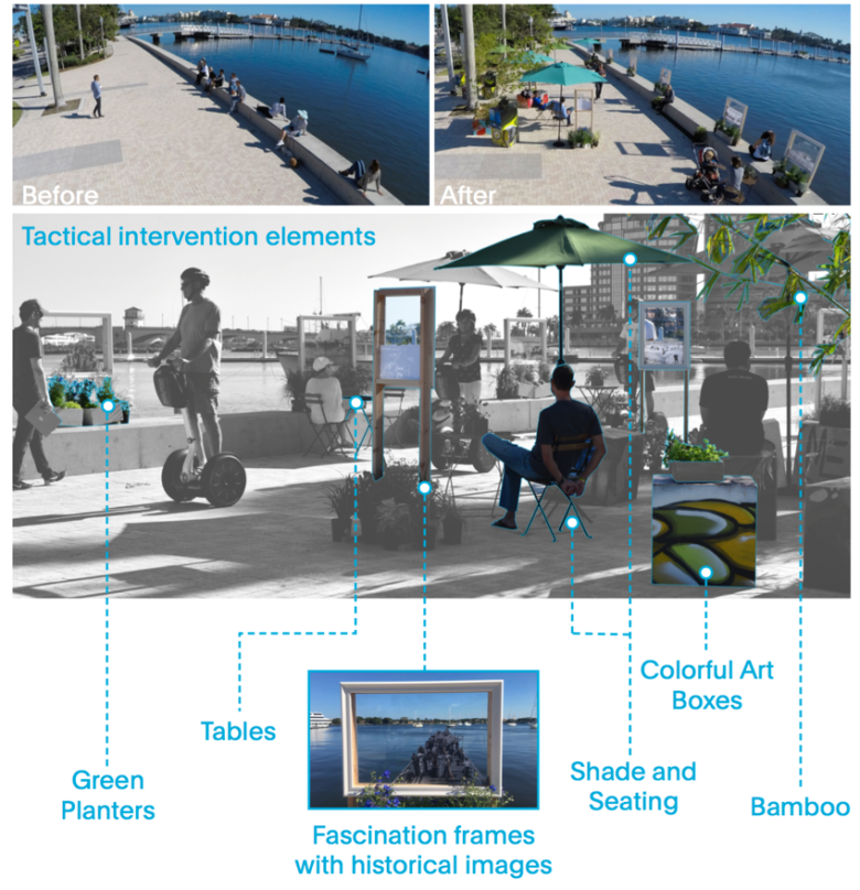 The tactical intervention had a statistically significant and positive effect on perceived stress, perceived social trust, perceptions of place belonging and quality perceptions of place, as compared to the control. Trends in other dimensions of mood were in a positive direction. The promenade’s new features promoted aspects of psychological restoration, while achieving West Palm Beach’s goal of encouraging more human engagement on the waterfront.