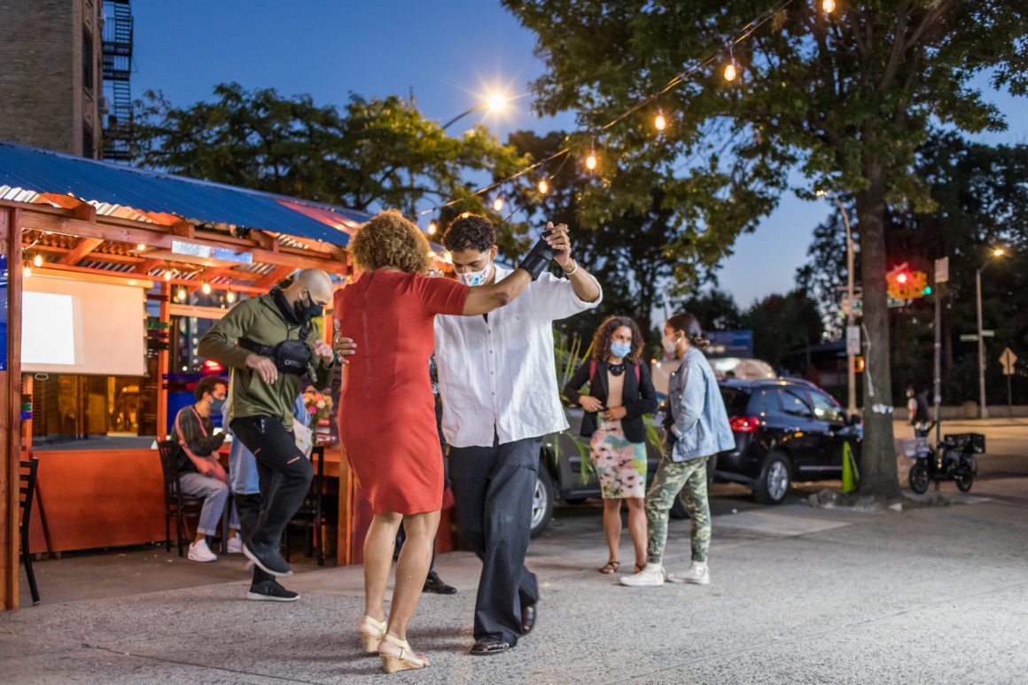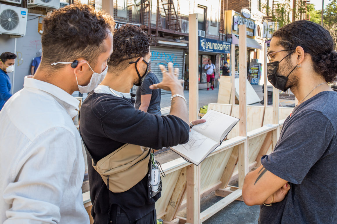 On a balmy summer Saturday in the Bronx on the corner of Kingsbridge Road, the sidewalk is bustling with socially-distant activity. A collection of volunteer designers and neighbors diligently assemble donated plywood to construct a sidewalk barrier that will provide the beloved Tropical Rotisserie eatery with much needed outside seating, in the wake of COVID-19.